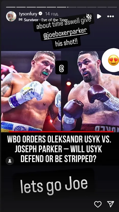 У боксерському світі вже почали активно реагувати на таке рішення організації. Тайсон Ф'юрі теж не став мовчати та залишив свої "п'ять копійок" щодо проведення бою Усик – Паркер. "Циганський король" підтримав новозеландського боксера, з яким вже давно тримає дружбу, пише 24 Канал із посиланням на інстаграм Ф'юрі.